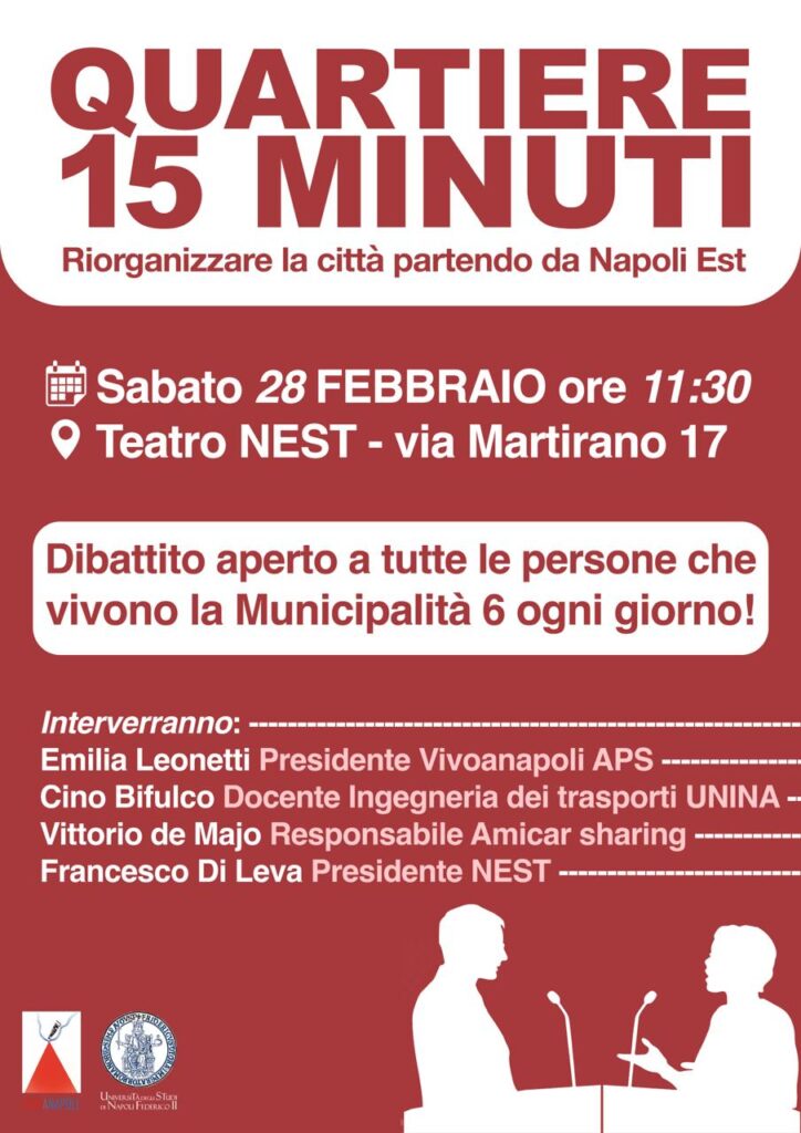 Vivoanapoli in collaborazione con l università Federico II di Napoli arriva al teatro Nest. Con Francesco di Leva in un dibattito pubblico a cui i cittadini dell’ area orientale sono invitati, parleremo di riorganizzare e riqualificare la città partendo da San Giovanni -Barra- Ponticelli . Quartiere 15 minuti significa rimettere al centro i cittadini pensando a interventi che migliorino la qualità della vita: dai trasporti, al verde, agli spazi della cultura, ai servizi.