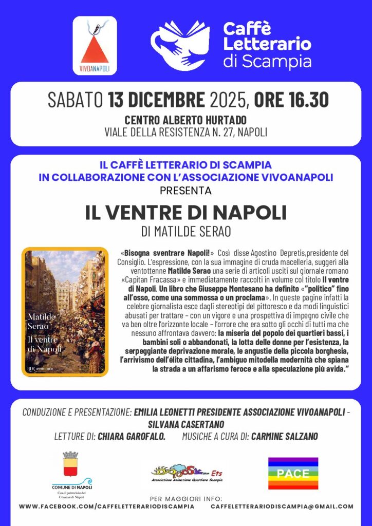 Sabato prossimo, 13 dicembre 2025, ore 16:30 presso il CENTRO ALBERTO HURTADO – Viale della Resistenza n. 27, Napoli, in collaborazione con l’ Associazione VIVOANAPOLI con il Patrocinio del Comune di Napoli –  http://comune.napoli.it/ la condivisione della Municipalità 8, il Caffè Letterario di Scampia propone la lettura de IL VENTRE DI NAPOLI di Matilde Serao