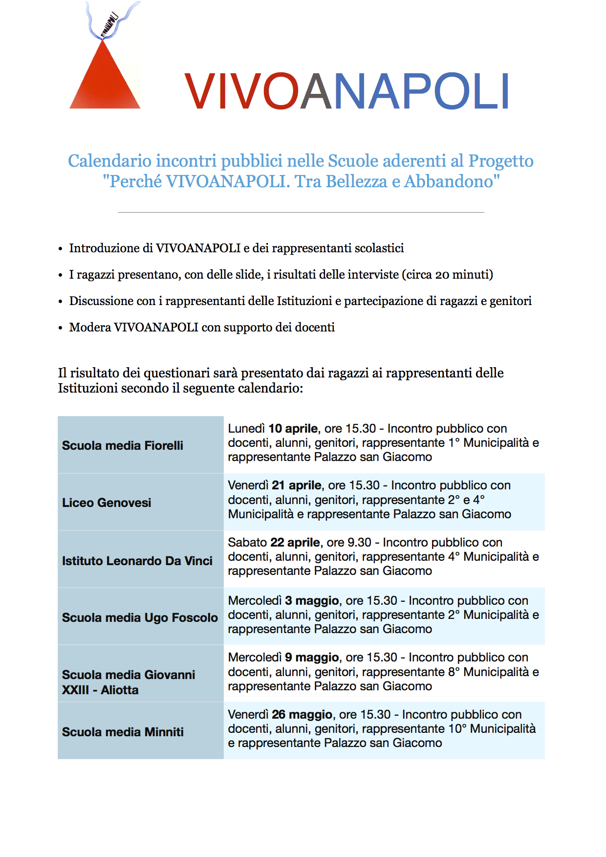 Obbiettivo: scopo dell’attività condotta da VIVOANAPOLI in collaborazione con gli Istituti prima elencati è di sollecitare l’attenzione al bene comune, richiamare l’importanza di essere cittadini attivi, la necessità di interrogarsi sulla qualità della nostra vita in comune e di contribuire, ognuno per la propria parte, al Governo della città.